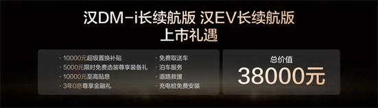 此次,汉DM-i长续航版共推出4款车型,补贴后售价15.98万~18.98万元;汉EV长续航版共推出3款车型,补贴后售价17.38万~20.58万元(10月31日前完成购车可享1万元超级置换补贴)。同时,比亚迪还为用户准备了包含置换补贴在内的至高价值3.8万元七大礼遇。